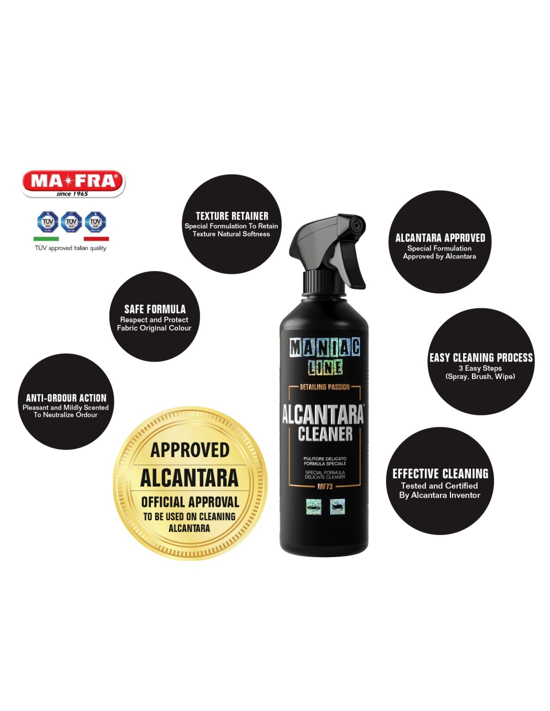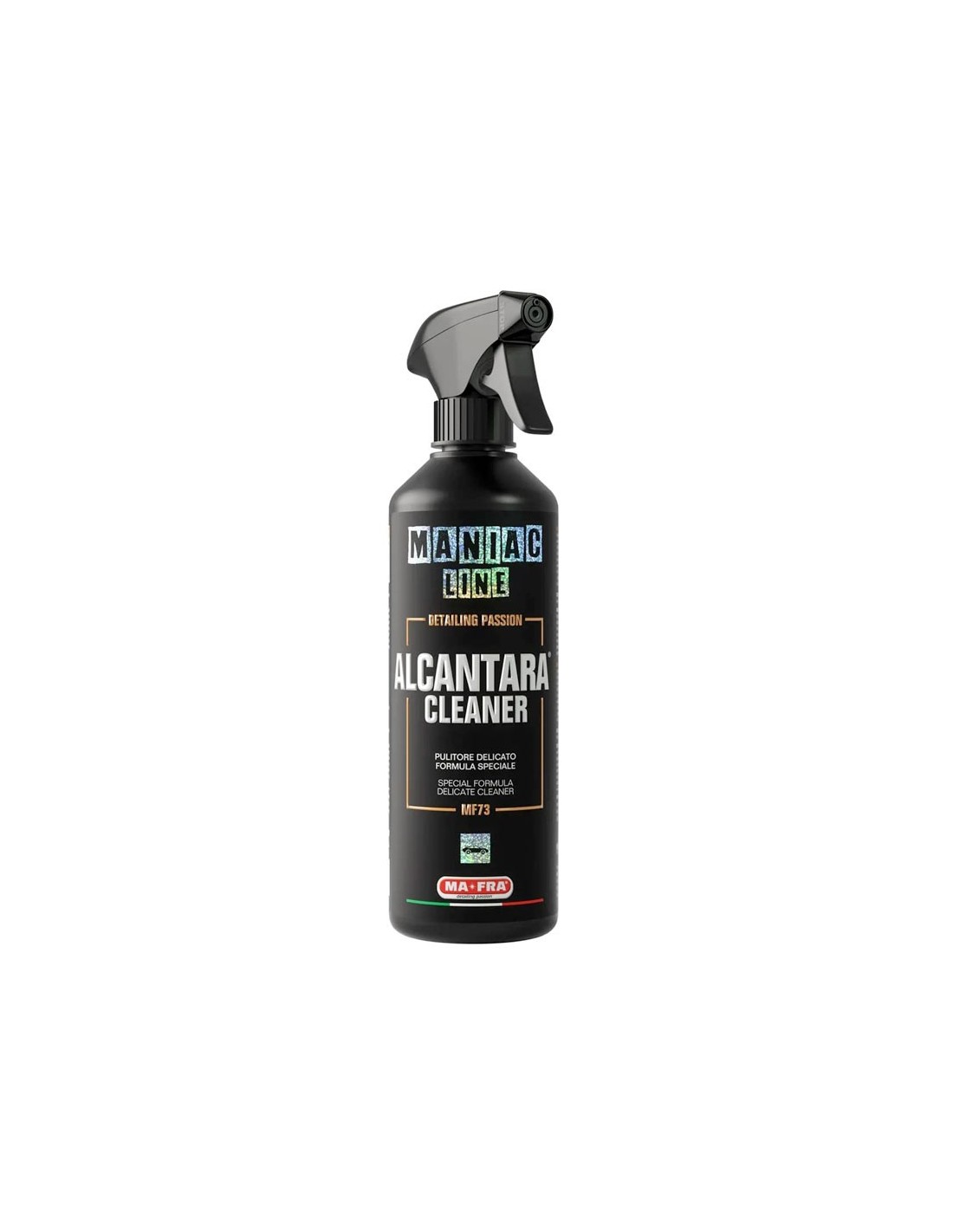 O Alcantara Cleaner da Maniac Line é um detergente específico para limpar e renovar superfícies em Alcântara, microfibras e tecidos delicados. Remove eficazmente sujidade, manchas e odores sem comprometer a textura ou cor do material. A sua fórmula avançada é capaz de eliminar resíduos gordurosos, marcas de uso e impurezas acumuladas, deixando as superfícies macias e com um aspeto renovado. Seguro para interiores automóveis e móveis revestidos a tecido.VANTAGENS