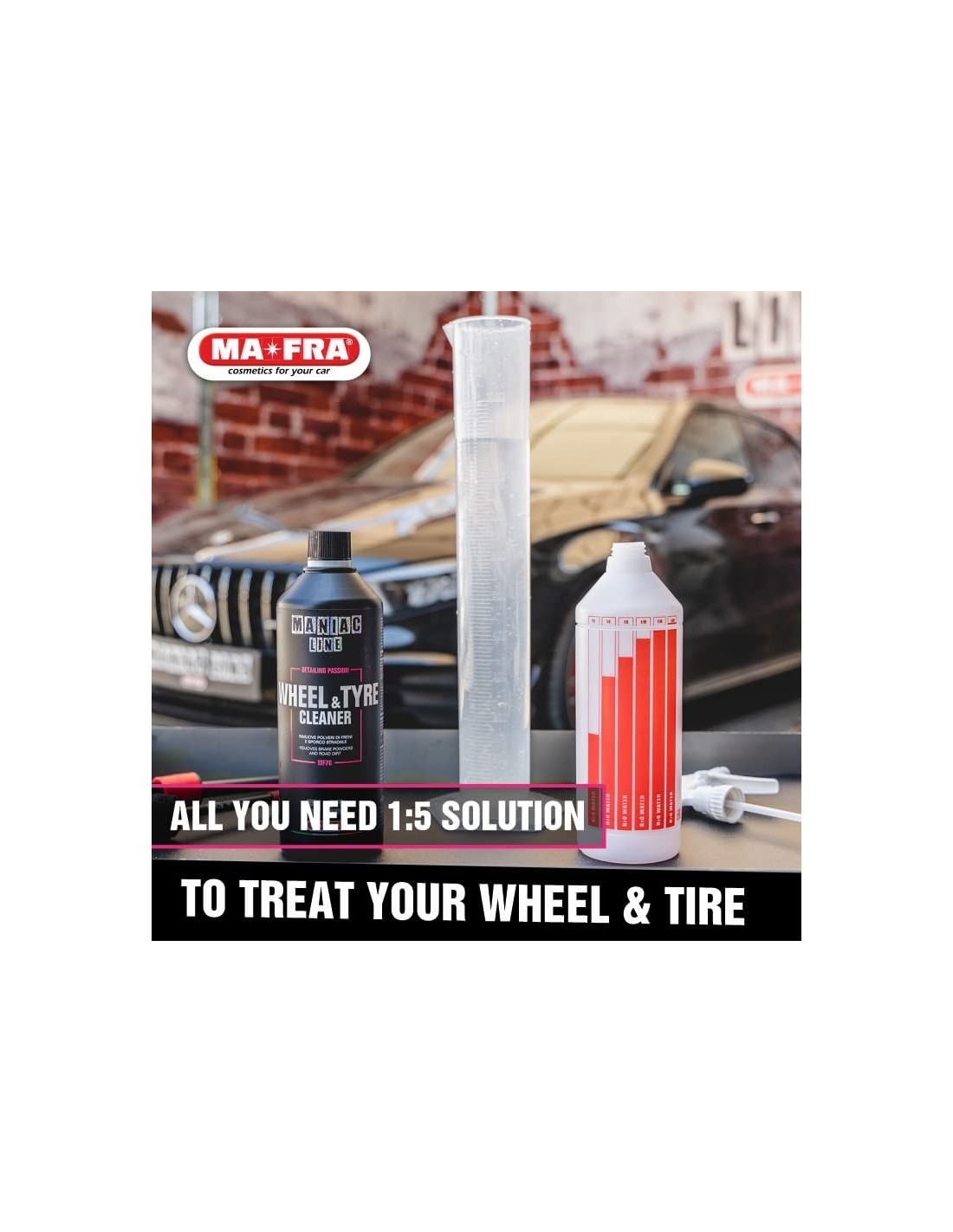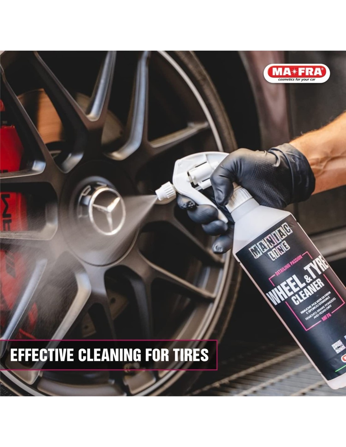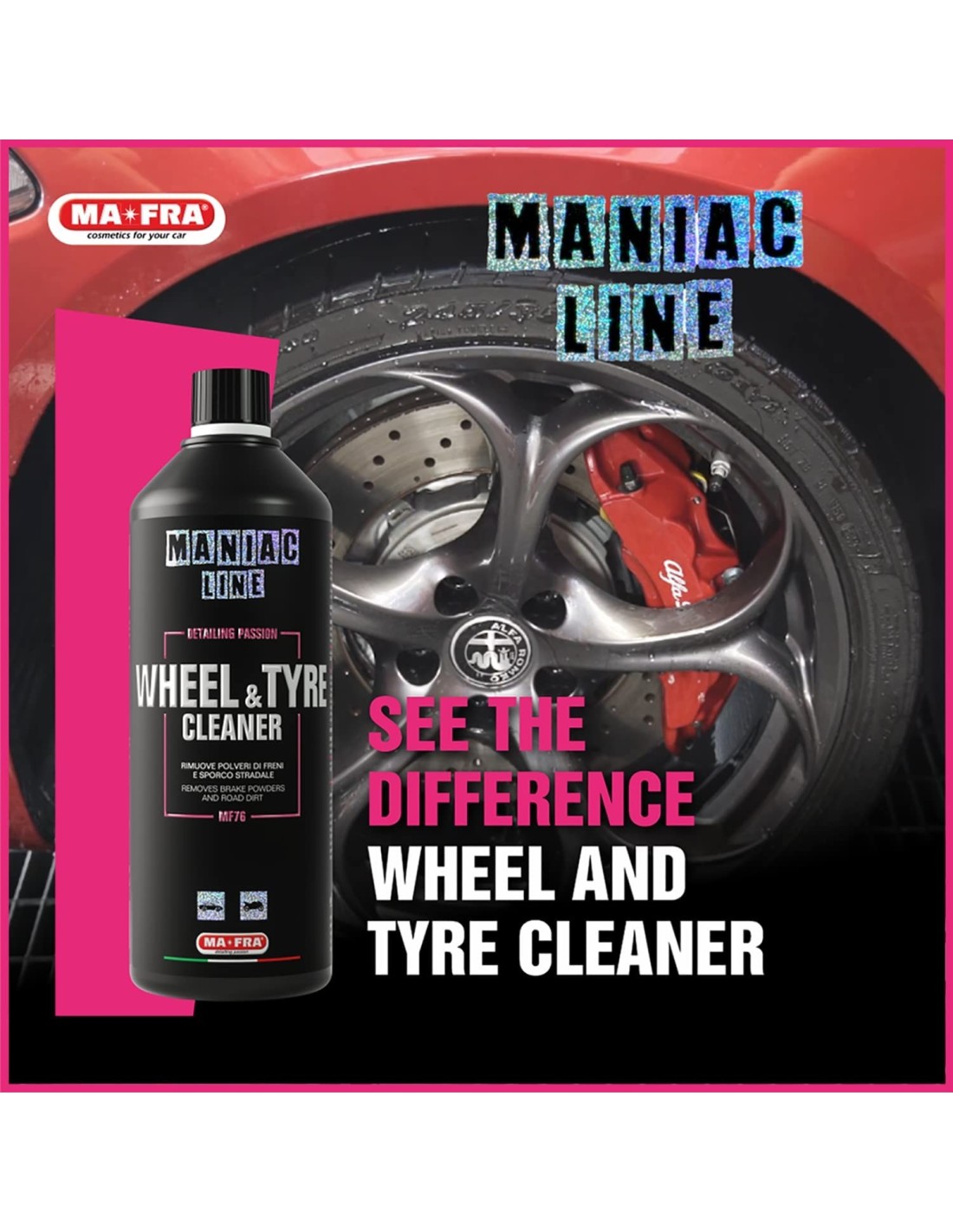 O Wheel & Tire Cleaner da Maniac Line é um poderoso limpador desenvolvido para eliminar eficazmente sujidade, poeiras de travões e resíduos de estrada das jantes e pneus. A sua fórmula avançada penetra profundamente, restaurando o aspeto original e preparando os pneus para a aplicação de dressings. Seguro para todos os tipos de jantes, incluindo liga leve, cromadas, anodizadas e pintadas, proporcionando uma limpeza eficaz sem danificar as superfícies.VANTAGENS